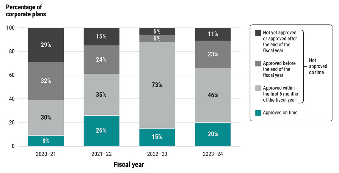 The corporate plans approved before the end of the fiscal year decreased from 32% in 2020–21 to 24% in 2021–22 and 6% in 2022–23, then increased to 23% in 2023–24.
