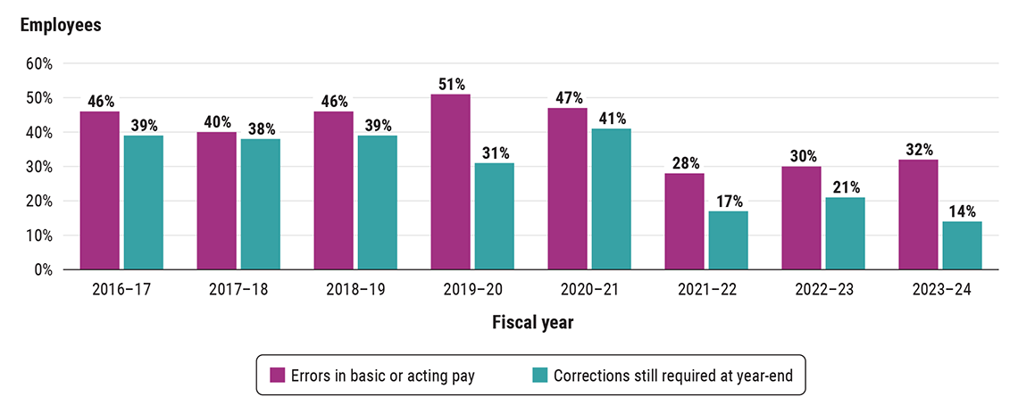 The chart shows that the percentage of employees in our sample who had an error in basic or acting pay during the fiscal year decreased from 46% in 2016–17 to 40% in 2017–18 and then increased to 46% in 2018–19 and to 51% in 2019–20. The percentage then decreased to 47% in 2020–21 and to 28% in 2021–22. In 2022–23, the percentage increased to 30% and increased again in 2023–24 to 32%.