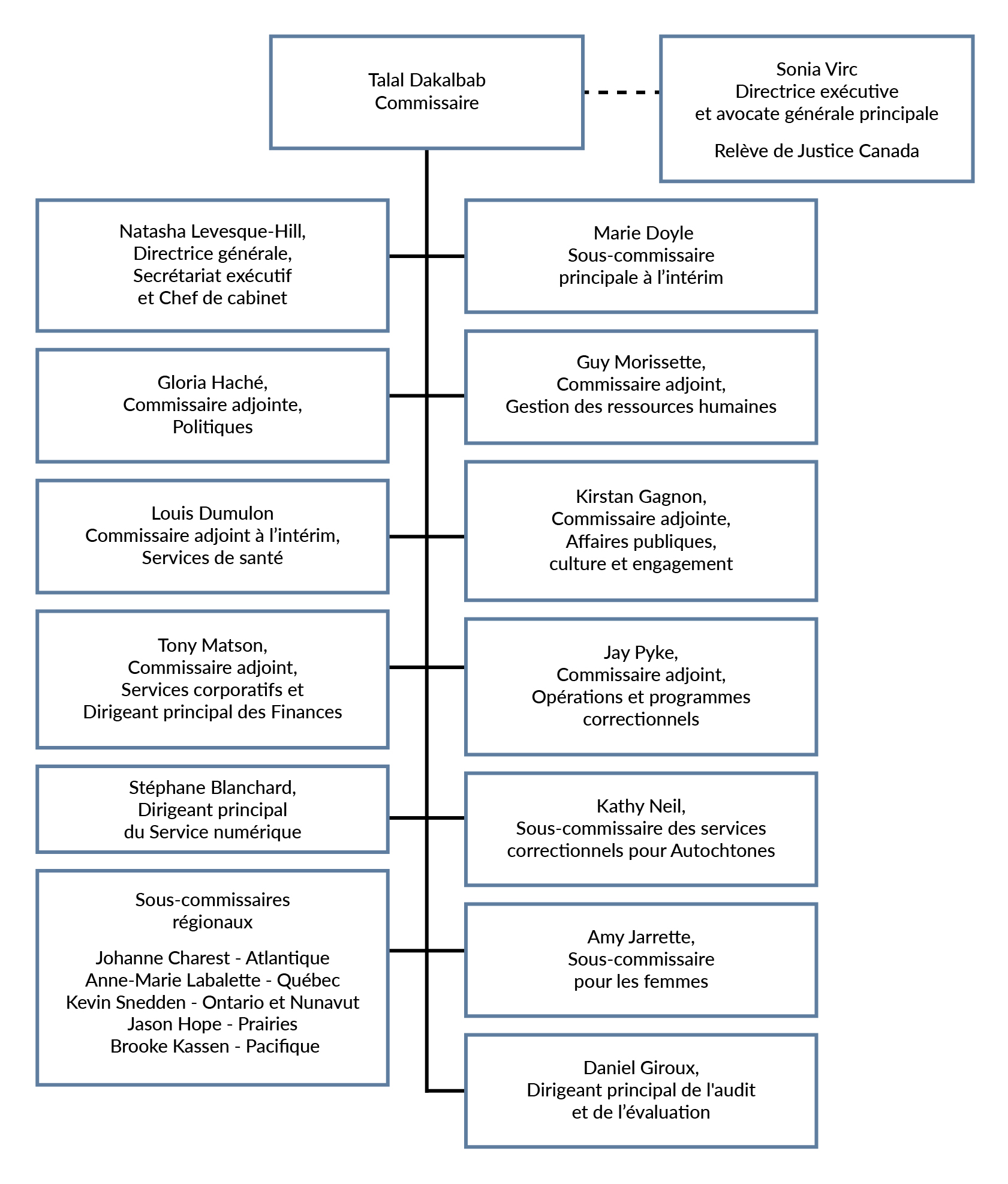 Service correctionnel Canada est dirigé par la commissaire du Service correctionnel, qui relève du ministre de Sécurité publique du Canada. La commissaire est appuyée par un comité de direction qui est composé de cadres œuvrant aux paliers national et régional.