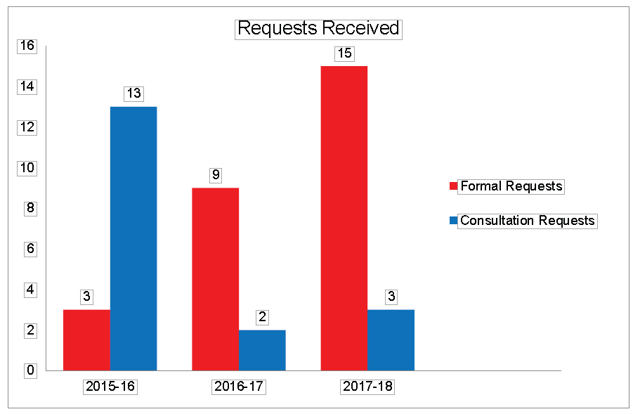 In the last three reporting periods, the statistics indicate increase of 400% for formal requests and decrease of 77% for consultation requests. The overall volume of requests has increased by 13% from 16 requests in 2015-16 to 18 requests in this reporting period.
