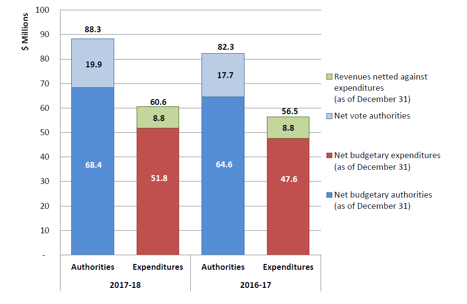 As of December 31, 2017, the total budgetary authorities available for use for the year increased from $64.6 million in 2016-17 to $68.4 million in 2017-18 due to the following: