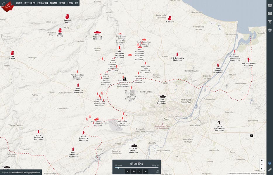 “You take 125 war diaries from D Day to the end of the war, and it tells you what each unit was doing, every single day,” says Kehler. “They also give a geographical location. These have a military grid reference. That allows you, with a paper map, to figure out exactly where they were, within 100 metres. With that intersection now, we can make a web map and show all of that.”