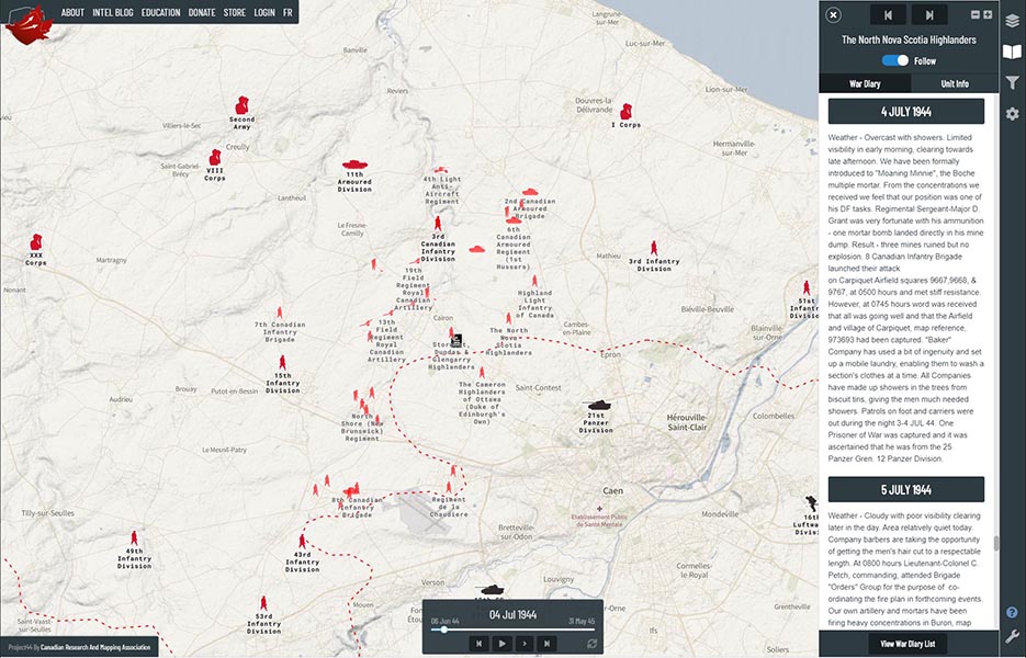 Project ‘44, co-created by Nathan Kehler and Drew Hannen of the Ottawa-based Canadian Research and Mapping Association (CRMA), with sponsorship from Veterans Canada, has digitized the daily logs, also known as war diaries, kept by each Canadian unit during the war, and previously only available to researchers in their original form at the Library and Archives of Canada. The project also digitized detailed maps that plot these soldiers’ movements across Europe toward victory.