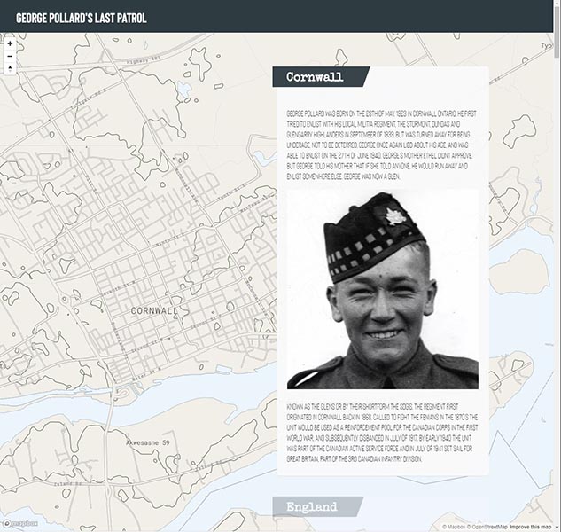 The site also features “story maps” that recount the experiences of notable individual soldiers in depth -- an initiative launched in conjunction with Defining Moments Canada and the Juno Beach Centre, as they developed teaching materials for Canadian schools. These soldiers include Phillip Pochailo, Charles Henry Byce, and George Pollard, one of 20 Canadian soldiers killed in the Ardenne Abbey massacre shortly after D-Day. Another eminent Canadian profiled is Mona Parsons, who aided Dutch resistance fighters,[4] spent years as a prisoner of war and made a daring escape, eventually returning to Canada.