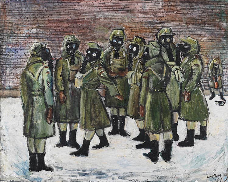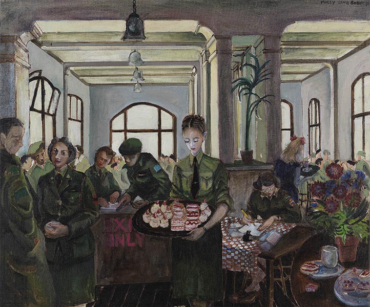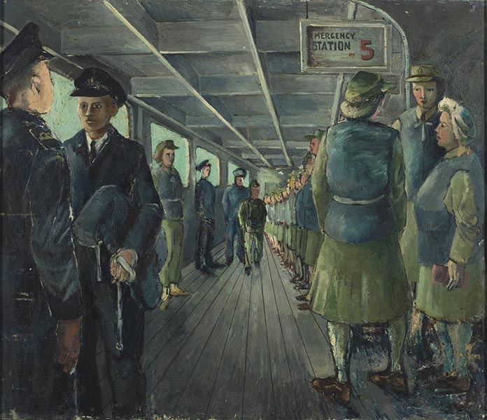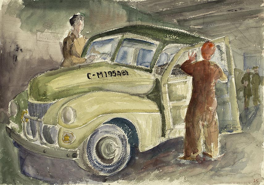 As a member of CWAC herself, Bobak travelled across Canada during the war, and to England and Europe shortly after the war ended. Her paintings show women in training, marching, doing gas drills or working at various jobs. She also documented war damage to London and spent six weeks travelling around post-VE Day northwestern Europe in the back of a truck, sketching and painting what she observed.