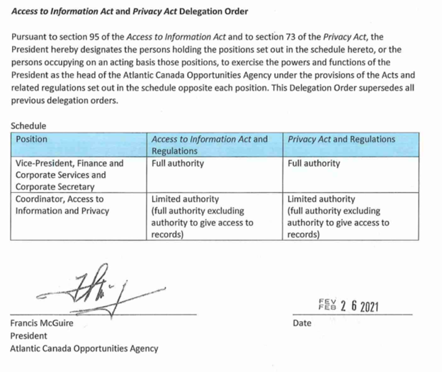 For the purpose of the Access to Information Act, the President delegated full authority to the Vice-President, Finance and Corporate Services and Corporate Secretary, and partial authority to the ATIP Coordinator.