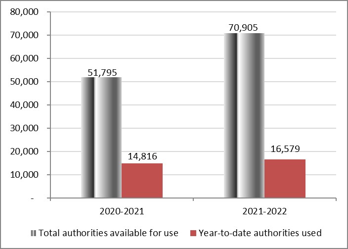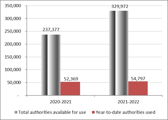 Total authorities available for use for the year ending March 31, 2022, amount to $330.0 million, an increase of $92.6 million compared to the $237.4 million available for use as of June 30, 2020. The increase of $92.6 million, or 39.0%, is explained by: