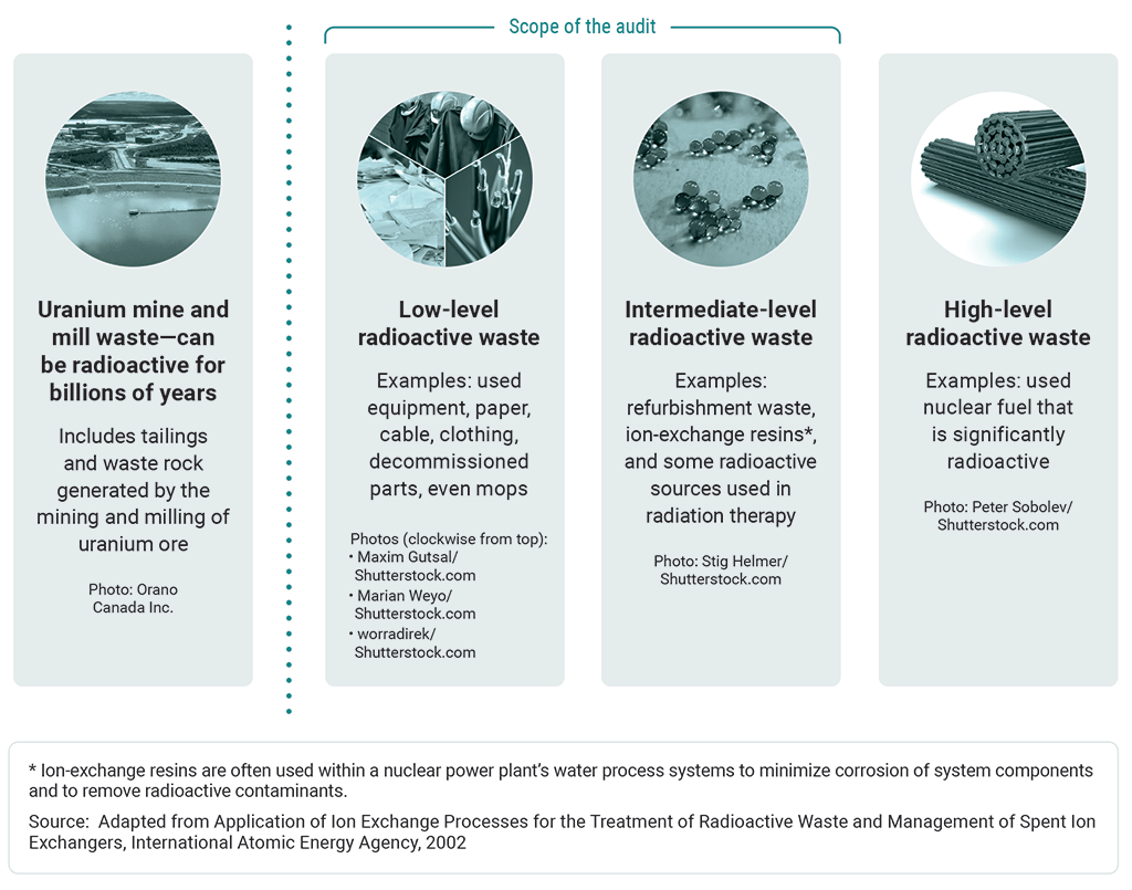 This chart shows Canada’s 4 classes of radioactive waste—uranium mine and mill waste, low-level radioactive waste, intermediate-level radioactive waste, and high-level radioactive waste. It also indicates the 2 classes that are within the scope of the audit—low-level radioactive waste and intermediate-level radioactive waste. Each class of radioactive waste includes photos of examples.