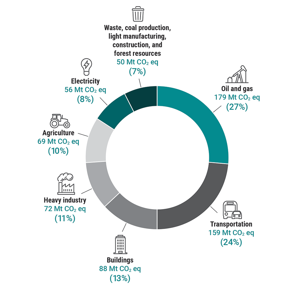 Canada’s total greenhouse gas emissions (in megatonnes of carbon dioxide equivalent, Mt CO2 eq, rounded) by sector (2020)