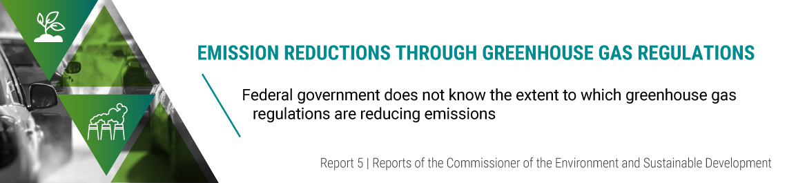 - Environment and Climate Change Canada did not measure or report on the contributions of the greenhouse gas regulations we examined toward Canada’s 2030 target for emission reduction.
