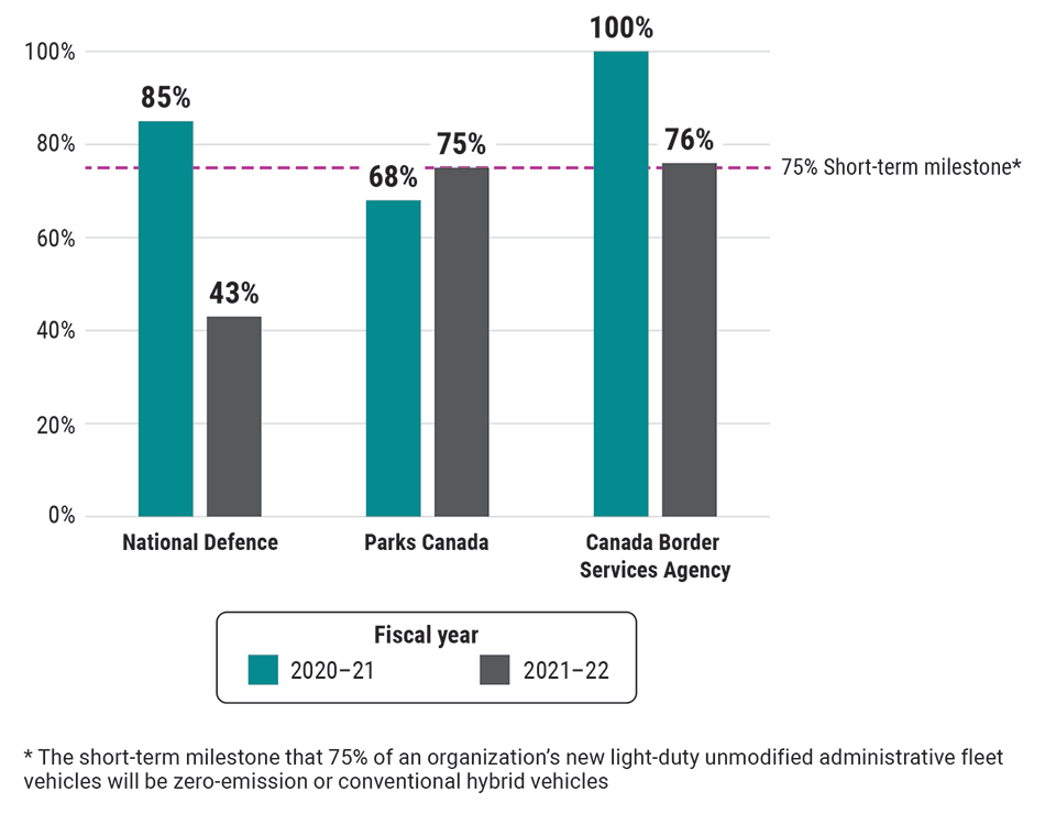 Only the Canada Border Services Agency met the short-term milestone of 75% in both years—that is, that 75% of an organization’s new light‑duty unmodified administrative fleet vehicles will be zero‑emission or conventional hybrid vehicles. In 2020–21, 100% of the agency’s vehicle purchases were zero‑emission or conventional hybrid vehicles, while in 2021–22, 76% were.