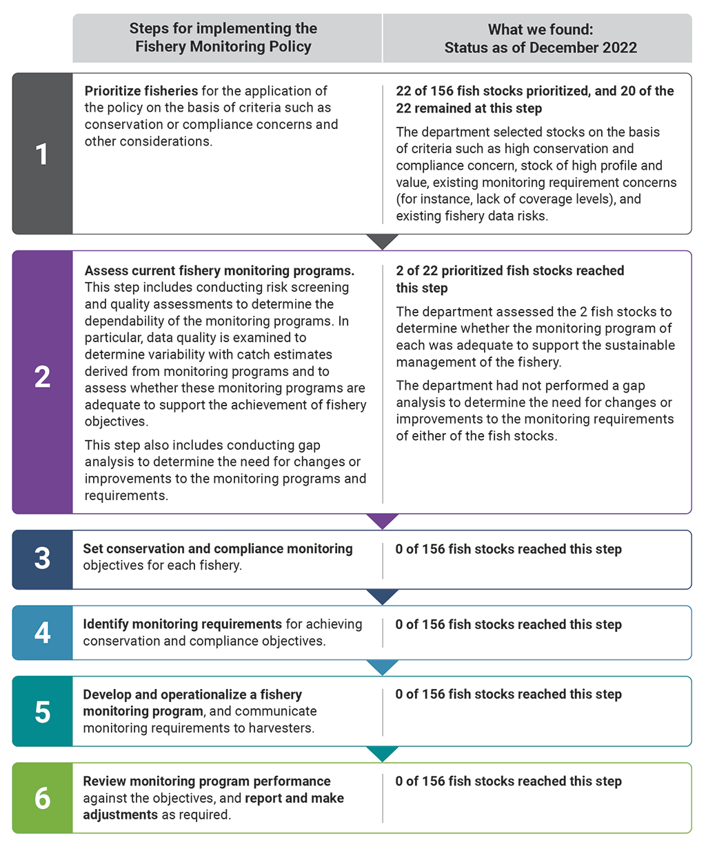 The following table shows the 6 steps for implementing Fisheries and Oceans Canada’s Fishing Monitoring Policy and the status that we found of each step as of December 2022.