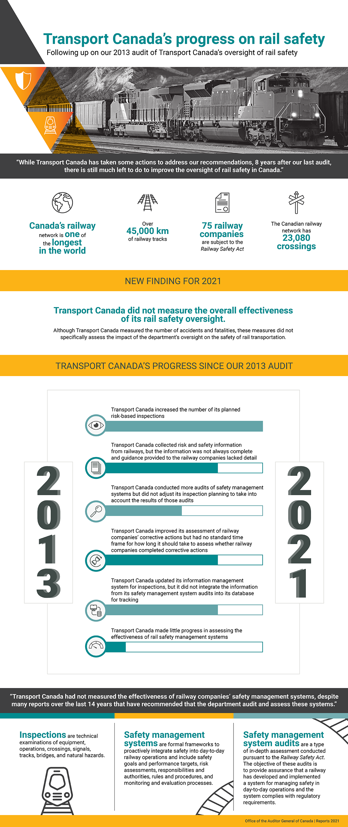 From 2013 to 2021, we assessed Transport Canada’s progress as unsatisfactory in the following 2 areas: