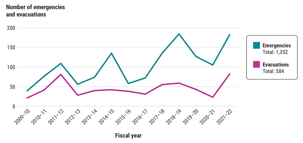 The number of emergencies and evacuations in First Nations communities (2009–10 to 2021–22 fiscal years)