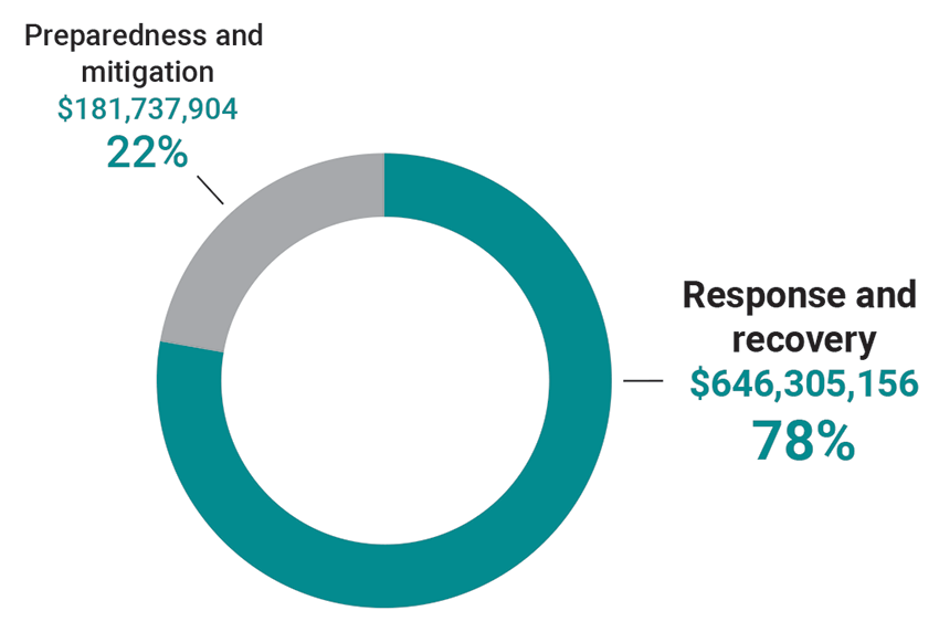 From the 2018–19 to 2021–22 fiscal years, the department spent more money on response and recovery ($646 million) than on preparedness and mitigation ($182 million).