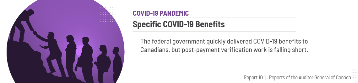 With its response to the COVID‑19 pandemic, the Government of Canada set an objective of helping Canadians as quickly as possible. The COVID‑19 emergency programs that we audited achieved that objective. They quickly offered financial relief to individuals and employers, prevented a rise in poverty, mitigated income inequalities, and helped the economy to recover from the effects of the pandemic.