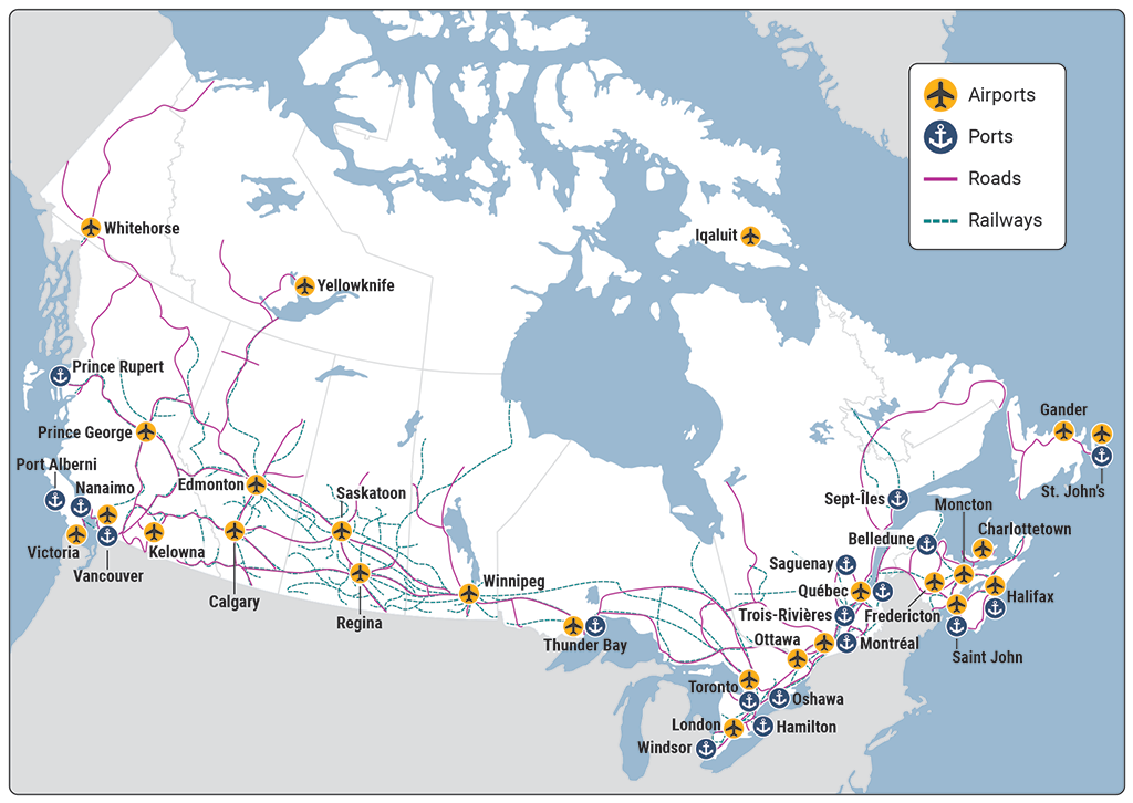 This map shows where 4 selected components of Canada’s trade-related transportation system are located. The selected components are airports, ports, roads, and railways.