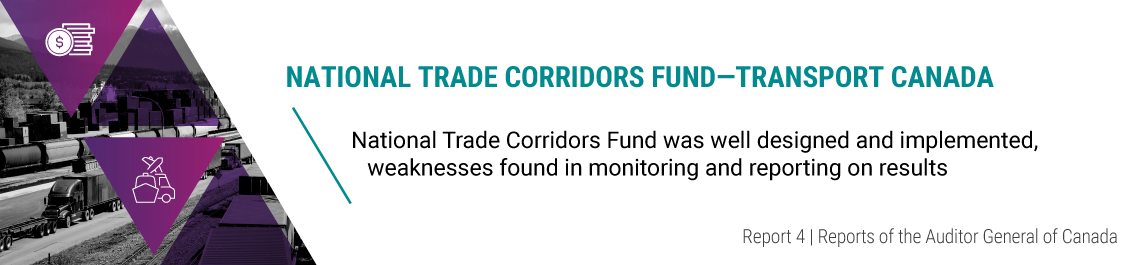 Overall, Transport Canada did a good job of designing and implementing the National Trade Corridors Fund but did not track and report on its results well. Launched in 2017, the fund has the objective of improving the movement of goods across Canada through the strengthening of its network of roads, rails, airports, and seaports by 2028. These transportation corridors are important to foster trade through imports and exports and contribute to Canada’s economic health.