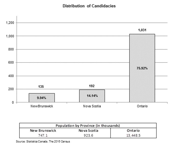 Distribution of Candidacies Province Number of candidacies Percentage New Brunswick 135 9.94% Nova Scotia 192 14.14% Ontario 1,031 75.92%