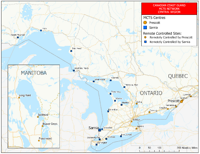 The Sarnia MCTS centre is in south-east Ontario, with remote controlled sites in these locations.