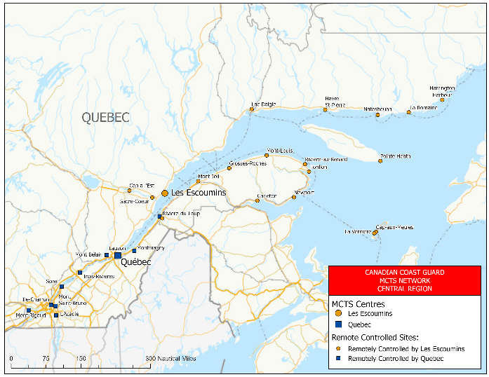 The Les Escoumins MCTS centre is in south Quebec, with remote controlled sites in these locations.