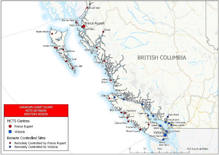 The Prince Rupert MCTS centre is in western British Columbia, with remote controlled sites in these locations.