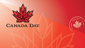 Image with a gradient background in red tones. Official Canada Day logo with a round and white stamp that includes a maple leaf.
