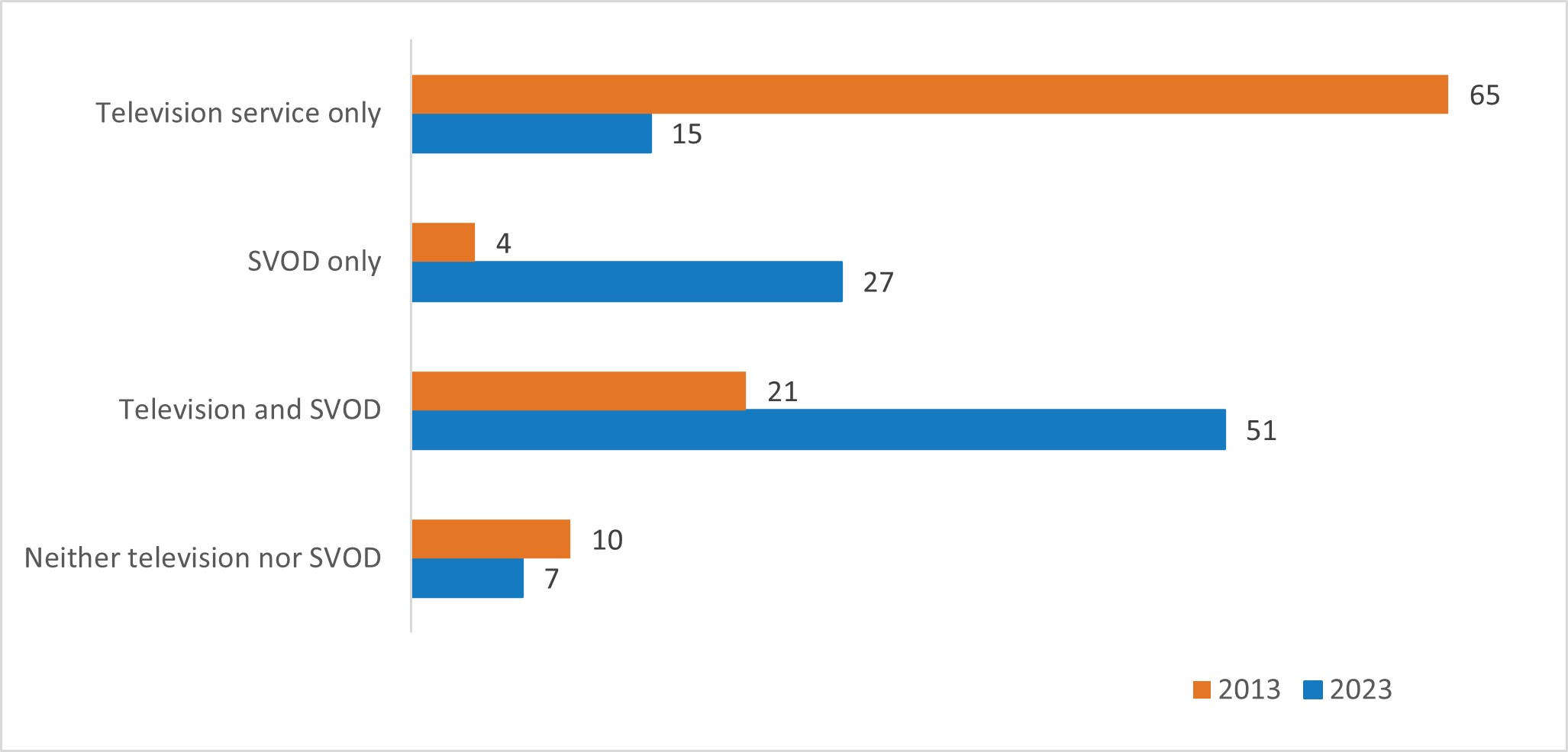 - Figure 1: Evolution of subscriptions by Canadian households to television and subscription-based video on demand services (by percentage), 2013 and 2023