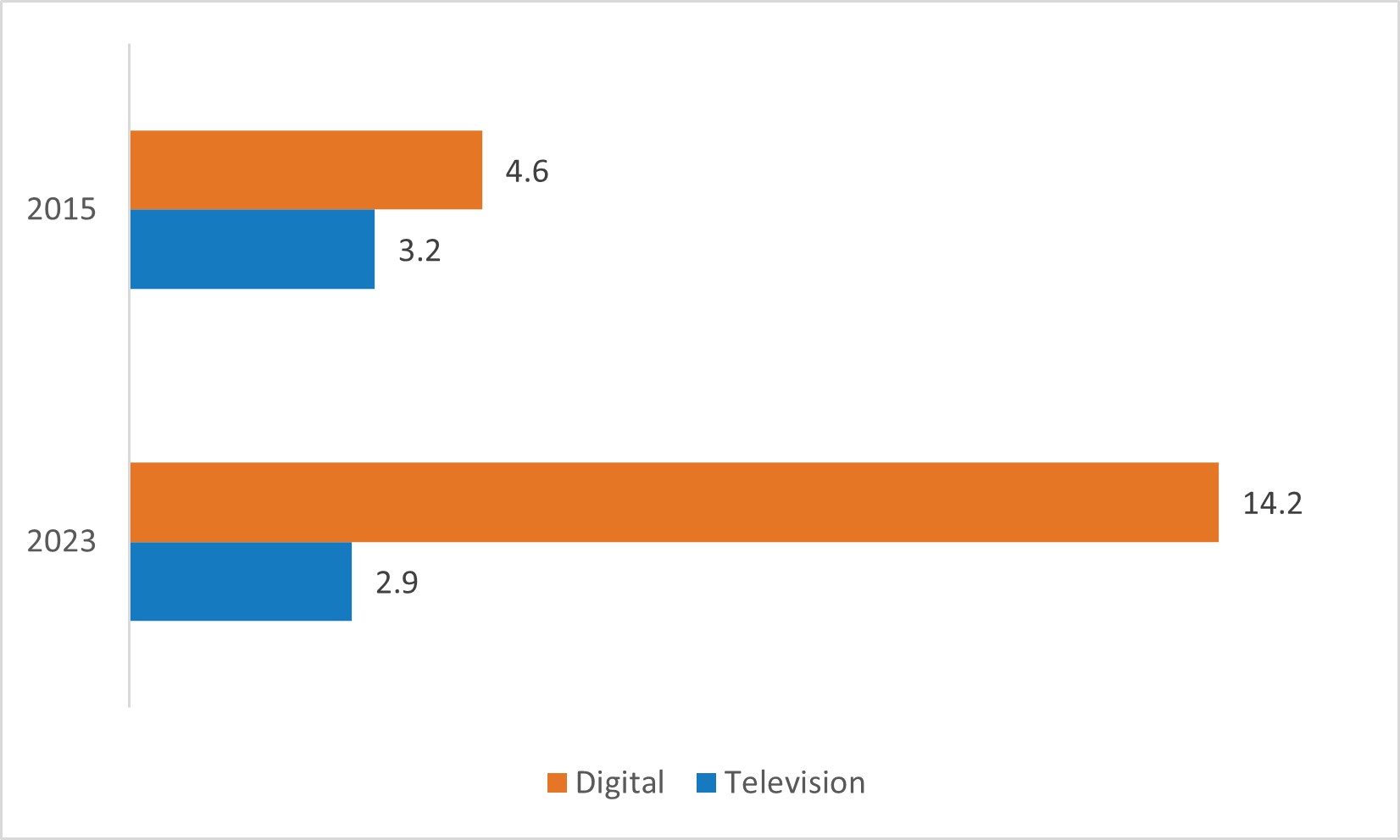 - Figure 3: Advertising spending in Canada: digital and television (in billion dollars), 2015 and 2023