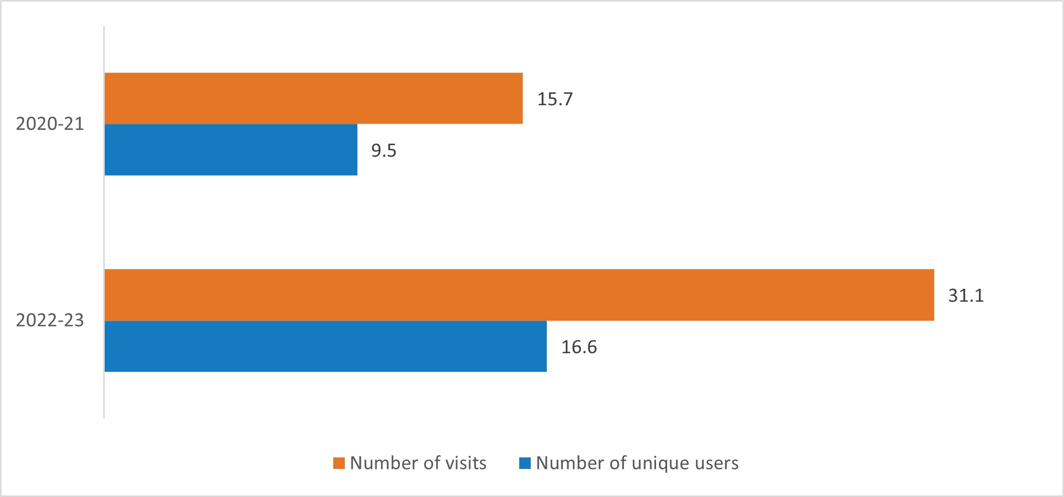 - Figure 4: Number of visits and unique users on TV5MONDEplus, in millions, 2020-21 and 2022-23