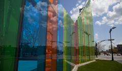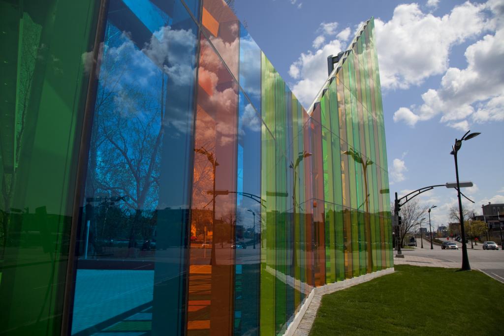 It is an enclosure created by large, multicoloured, transparent glass walls. The interior space forms a small public plaza. Passersby can sit and observe the continually changing conditions produced by the light passing through the coloured glass walls.