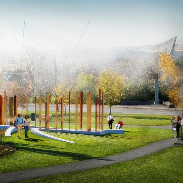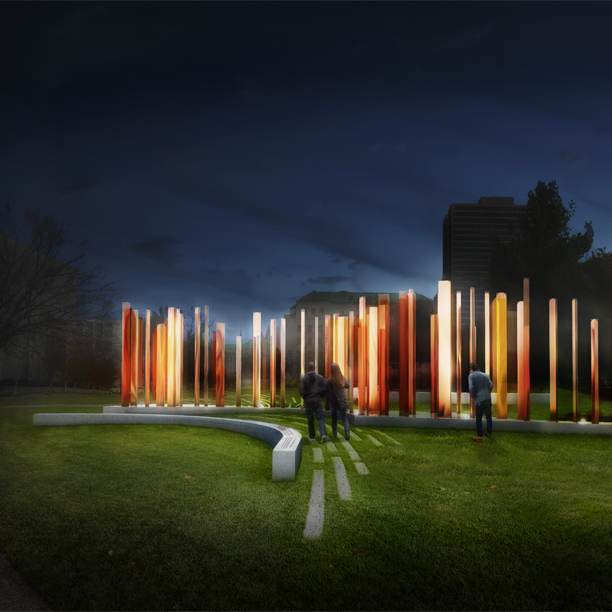 [Views of proposed design featuring 59 slim triangular-shaped columns 1.8 to 3.5 metres in height with a bright bronze finish. The columns are grouped on a concrete plinth over a 23 x 3 metre area and are flanked by four curved and straight concrete benches]