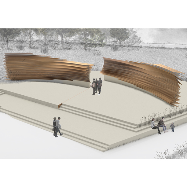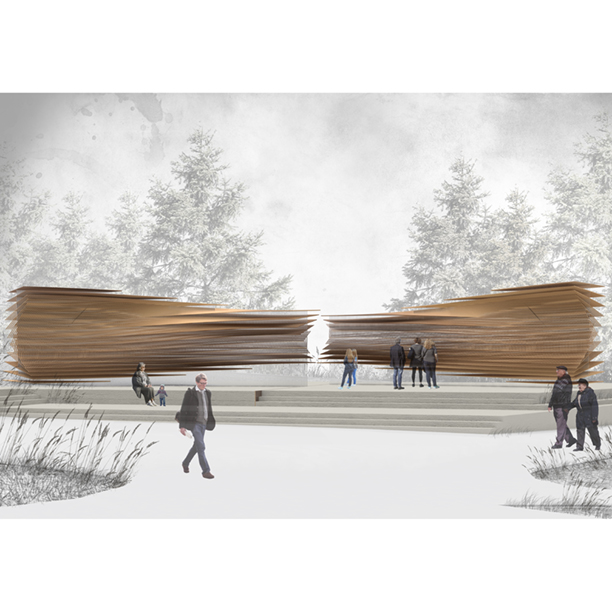 Paul Raff: “Over 4000 bronze rods would be arranged along 365 stainless steel fins, each one pointing at a unique angle of the sun, for every hour of every day, across a year. The memorial would be split in the middle at winter solstice, the darkest day of the year, inviting visitors to step through in a metaphorical journey from darkness and oppression to lightness and liberty.”