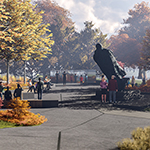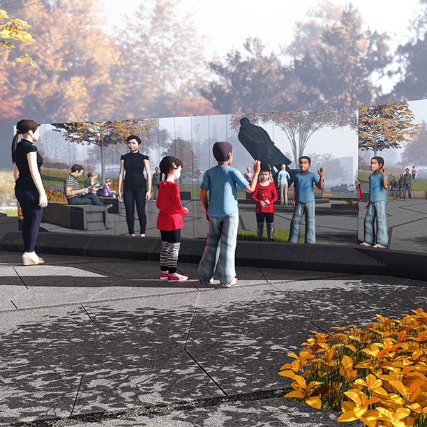 Overhead animated views of the Memorial site showing the toppling monument set within a granite paved area with surrounding seating and landscaping. Visitors are shown walking through the site, looking at the monument and mosaic of names, and seated on the benches.