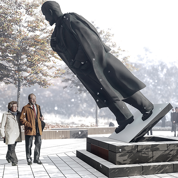 History has shown us that when people are ready to be free from tyrannical rule, statues are pulled down as a symbol of change and representing the possibility of limitless positive change. The proposal put forth by the team of Space2Place focusses on the moment a communist leader’s statue is toppling. A statue of Vladimir Lenin has been chosen because he represents the first leader of a communist state. The statue is set within a defined square that transitions into a Canadian park-like setting featuring irregularly placed boulders and benches constructed out of wood and stone. Ideas of freedom and hope are embodied by the befalling statue and enveloped in a space of contemplation and nature. A donors’ wall made of reflective stainless steel reflects the scene of the statue and its surroundings.