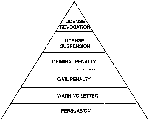 Relevant here is the notion of “responsive regulation”, Footnote 218 in particular the notion of an “enforcement pyramid”: Footnote 219