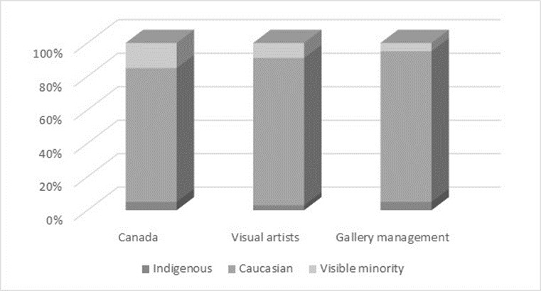 Maranda (2017) makes it clear that the cultural industry still has a long way to go with respect to cultural parity and pay equity between men and women. Women working in cultural institutions earn on average 20% less than men despite outnumbering them. According to the researcher, women are also less likely to be in leadership positions. Parity is also lacking in the visual arts distribution industry: while a majority of living artists are women (over 60%), only a small proportion of them are represented by galleries (Delgado 2018; agYU 2014). While the Canadian population is becoming increasingly diverse, cultural institutions have lagged behind, whether regarding staff, independent curators or artists (Maranda 2017).