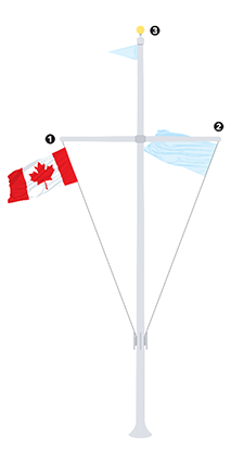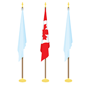 A common combination of flags is one that displays the National Flag of Canada with a provincial or territorial flag, and a municipal flag or an organization’s flag. In this case, the National Flag of Canada is in the centre with the provincial/territorial flag to the left and the municipal/organizational flag to the right, when facing the stand of flags.