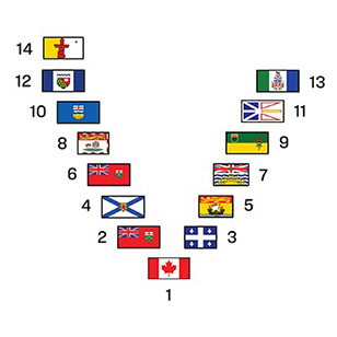 The order of precedence for the flying of the provincial flags is according to the date of entry of the province into Confederation, by population at the time of entry into the Dominion. The 3 territories’ flags are displayed in order of creation and follow those of the provinces.