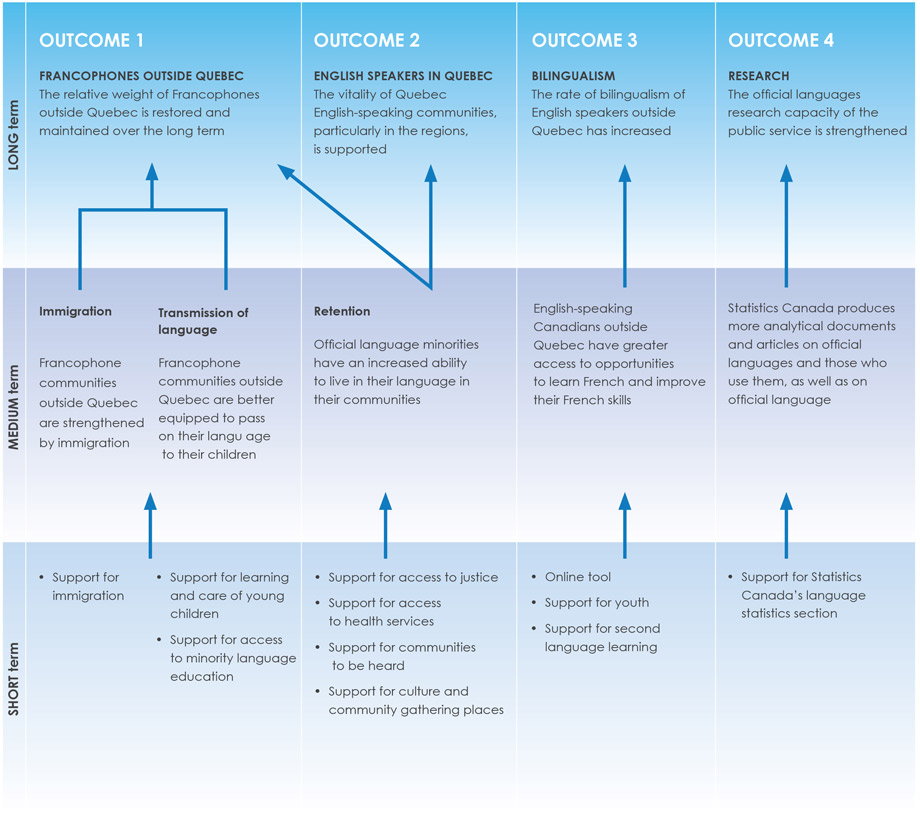 - In the short term, support for access to justice, support for access to health services, support for communities to be heard, and support for culture and community gathering places will contribute to increase the ability of official language minorities to live in their language in their communities, and thus to retention. In the medium term, retention will contribute to Outcome 1, which aims to ensure that the relative weight of Francophones outside Quebec is restored and maintained in the long term, as well as to Outcome 2, which aims to ensure that the vitality of Quebec's English-speaking communities, particularly in the regions, is sustained in the long term.