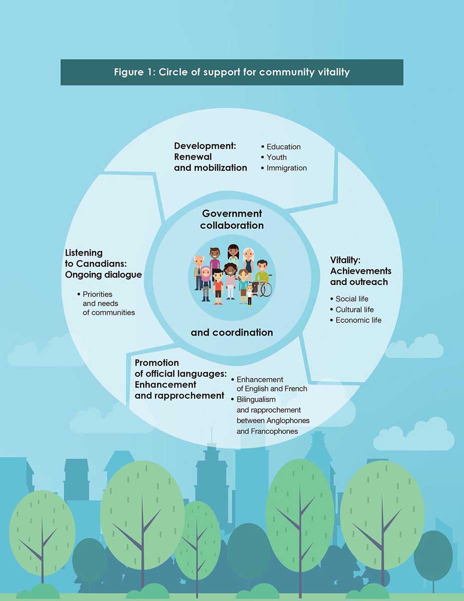 The circle of support for community vitality represents the support provided by federal institutions to official language minority communities at various stages of a community’s life.