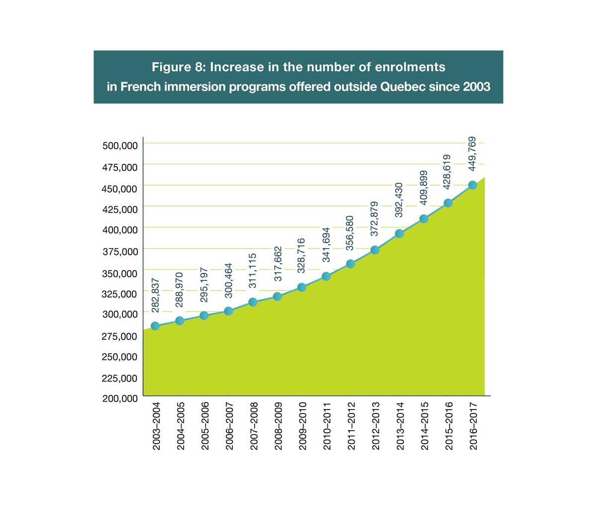 - Figure 8: Increase in the number of enrolments in French immersion programs offered outside Quebec since 2003
