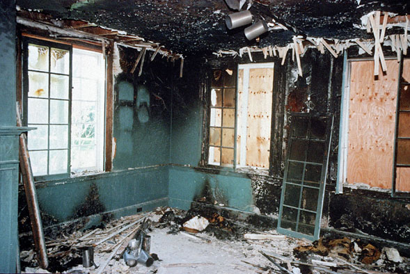 Interior view of fire site. Monitored smoke detection and a rapid response by the fire service resulted in serious damage being contained to only one room in the after-hours fire in this historic house museum.