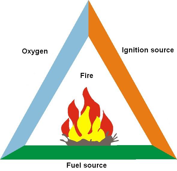 Fire is the state of combustion resulting from a chemical reaction that requires the presence of three elements in proper combination — a fuel source (anything that burns), oxygen (a component of air), and an ignition source such as heat or a spark — in order to begin and develop. This is often referred to as a "Fire Triangle," as shown in Figure 1.