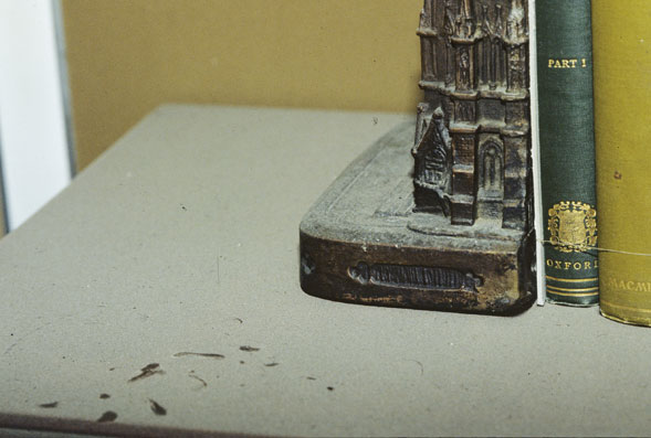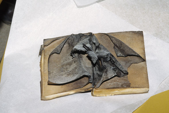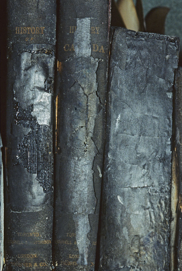 Organic materials from plant and animal products such as paper, textiles, and wood are highly susceptible to combustion, particularly if very dry. In general, the thinner the item, the more likely and quickly it will ignite and burn completely. For example, a single sheet of paper will ignite and burn rapidly, while books packed tightly together on a shelf may remain relatively undamaged except for damage to their spines (Figures 6 and 7), and perhaps soot deposits or discolouration on the head of the books.