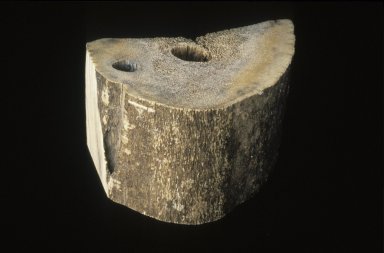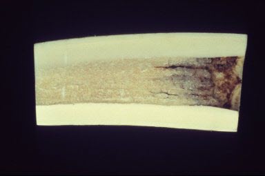 Whale bone, caribou bone, and antler are frequently used for carving by Inuit. Caribou bone and antler are generally used for smaller carvings, while whale bone is most frequently used for mid-size and larger carvings. Bone consists primarily of inorganic materials that provide strength and rigidity. Bone also has a soft organic component, which provides the capacity for growth and repair during the animal’s lifetime (consult CCI Note 6/1 Care of Ivory, Bone, Horn, and Antler). This organic component has usually deteriorated long before the bone was carved. Bone has a spongy central portion where the marrow resides. In whale bone carvings in particular, this area can be very large (Figure 1).