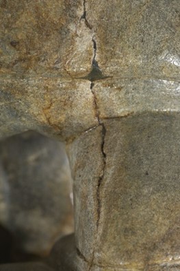 Stones from certain regions have iron pyrite inclusions. These inclusions have a rusty appearance and are found in seams in some types of stone used for carving (Figure 5). Iron pyrite inclusions can be problematic because they can begin to corrode in humid environments, causing splitting and staining. The corrosion products expand and can cause adjacent stone to split and spall. Sometimes, carvers will fill these areas of loss with epoxy resin adhesive, which can be seen on close inspection (Figure 6).