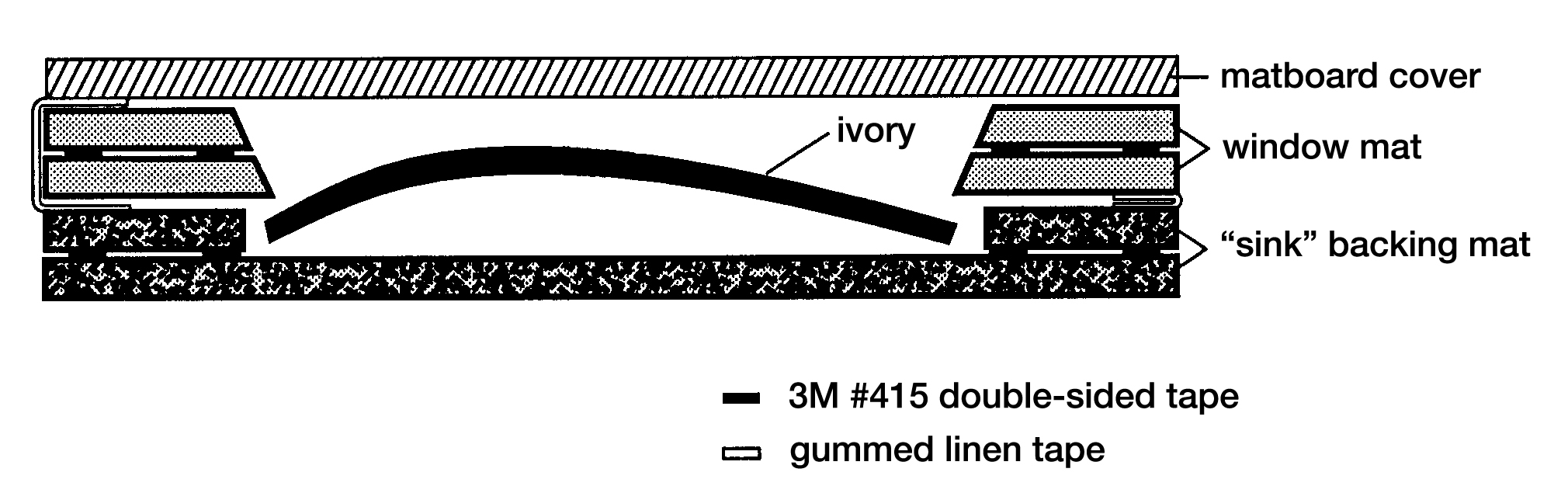 Paintings that must be moved and that do not have their own protective cases can be supported temporarily by gently sliding a piece of card under them. They should, however, be more permanently protected by enclosing them in individual, custom-made, acid-free boxes (see CCI Note 11/1 Making Enclosures for Books and Paper Objects), or in modified “sink” mats (Figure 1). An enclosure must not be so snug that it restricts an ivory’s natural movement. Never press on a warped ivory—it will crack.