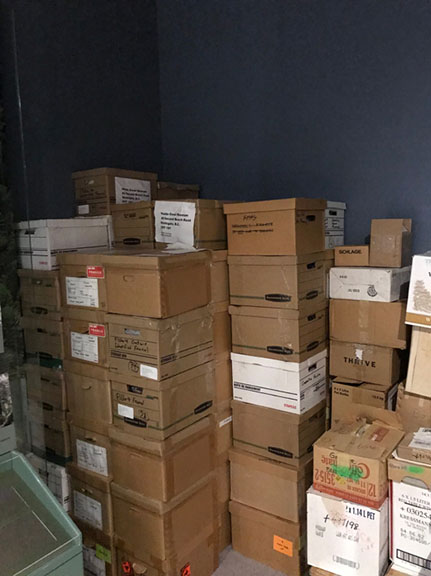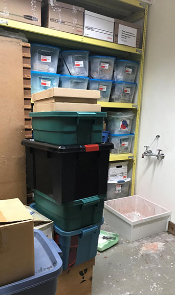 Figure 1. Before RE-ORG: lab storage room, showing how access to the collection was blocked by items on the floor.