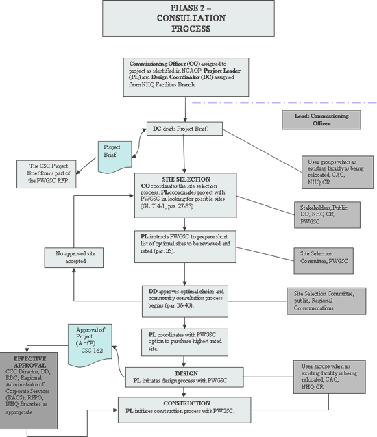 - The community consultation process begins after the Site Selection Committee has rated the sites and PWGSC has arranged an "Option to Purchase" agreement with the property owner.